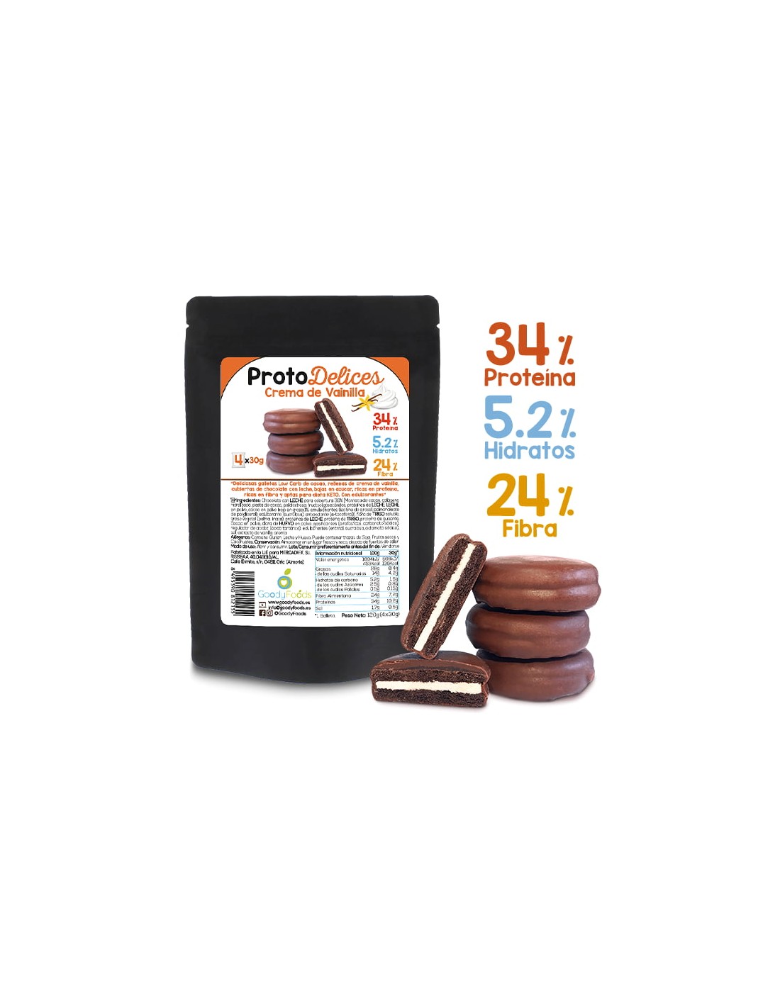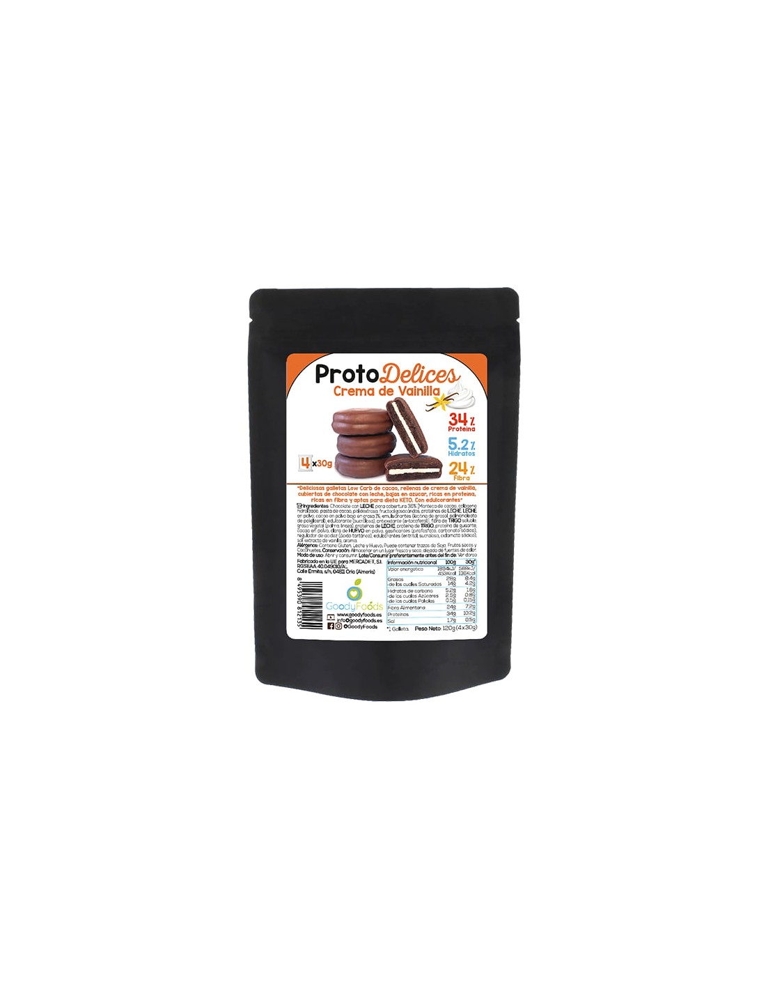 Las ProtoDelices crema de Vainilla son 4 crujientes y deliciosas galletas de cacao, rellenas con una dulce crema de vainilla y cubiertas con una gran capa de chocolate con leche, sin azúcares añadidos, con un 34% de proteína, 24% de fibra y tan sólo un 5.2% de carbohidratos, ideales para comer a cualquier momento y lugar. Las ProtoDelices crema de Vainilla vienen en un pack con 4 galletas ProtoDelices de 30g, cada 1 en su bolsa individual, donde cada unidad aporta 10.2 g de proteína, 7.2 g de fibra, y tan sólo 1.6 g de carbohidratos, siendo aptas para dieta KETO, dieta proteica, dietas Low Carb y una alternativa para quien quiera o necesite reducir el consumo de azúcares y carbohidratos sin renunciar a una dulce delicia.