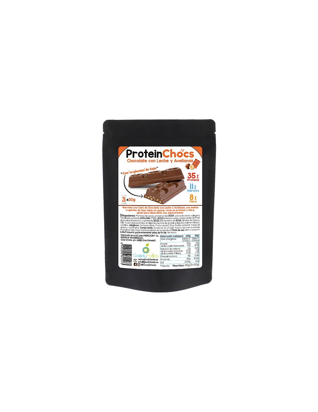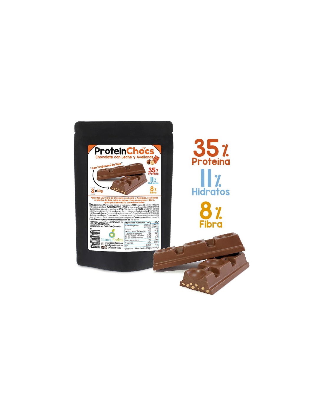 Protein Choks Chocolate con Leche son 3 dulces chocolatinas de chocolate con leche y bolitas de soja que le dan un toque crujiente, bajas en azúcar, con un 35% de proteína, sólo un 11% de carbohidratos y un 8% de fibra. Las barritas Protein Chocks Chocolate con Leche son aptas para dietas KETO, Proteica, dietas bajas en carbohidratos, y una opción para restar azúcares y carbohidratos, y sumar proteínas y fibra dentro de una dieta equilibrada.