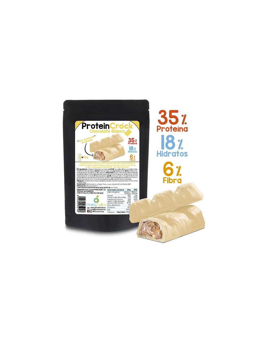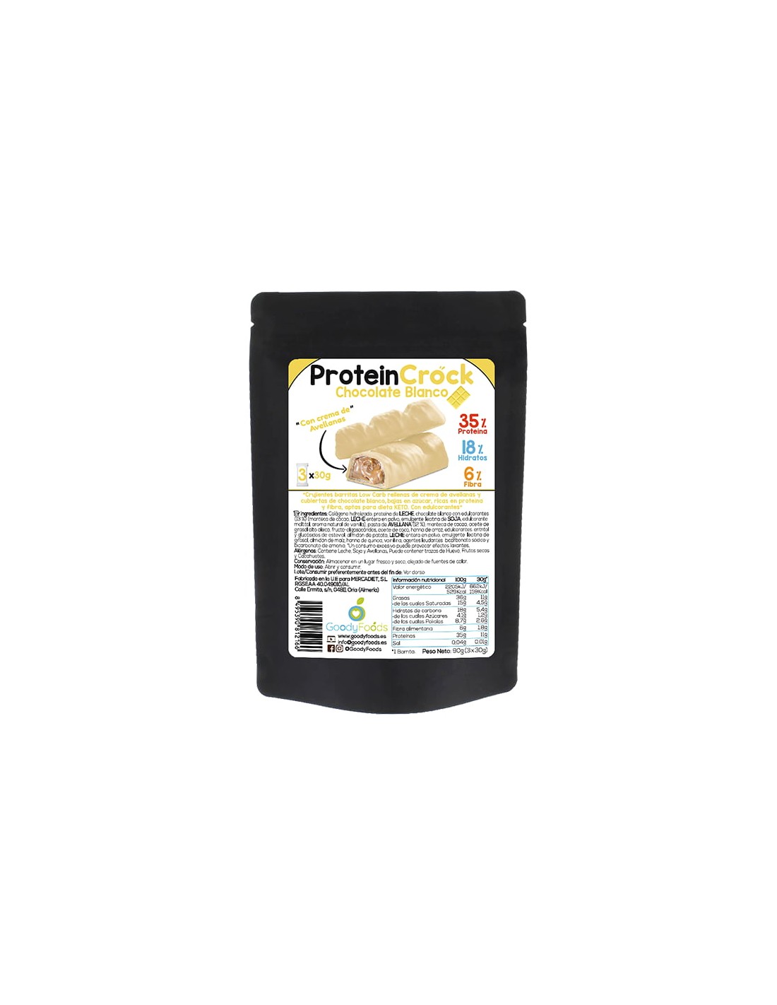 Protein Crock Chocolate Blanco son 3 dulces y crujientes barritas rellenas de crema de avellanas y cubiertas de una dulce capa de chocolate blanco, bajas en azúcar, con un 35% de proteína, sólo un 18% de carbohidratos y un 6% de fibra. Las barritas Protein Crock Chocolate Blanco vienen en un pack con 3 barritas envasadas individualmente de 30g, donde cada barrita aporta 11 g de proteína, 1.8 g de fibra y tan sólo 5.4 g de hidratos de carbono, siendo un dulce apto para dieta KETO, dieta proteica, dietas bajas en carbohidratos o Low Carb, y una alternativa para seguir una alimentación equilibrada, reducida en azúcares y carbohidratos, y rica en proteína y fibra.