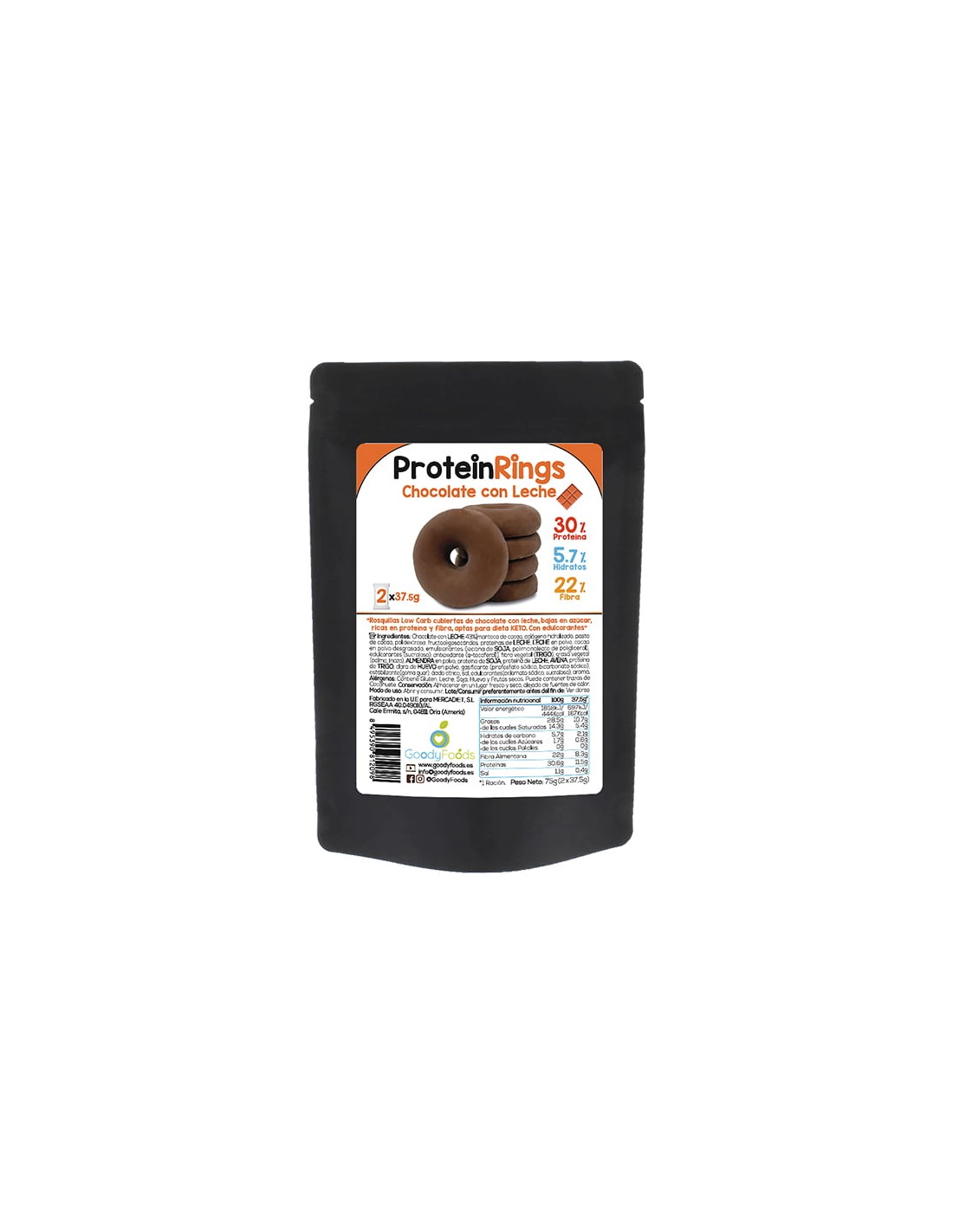Los Protein Rings Chocolate con Leche son 10 crujientes y dulces rosquillas cubiertas de chocolate con leche, bajas en azúcar, con un 30.6% de proteína, sólo un 5.7% de carbohidratos y un 22% de fibra. Los Protein Rings Chocolate con Leche vienen en un pack con 2 bolsistas o raciones individuales de 46g con 5 rosquillas cada una, que aportar 11.5 g de proteína, 8.3 g de fibra y tan sólo 2.1 g de carbohidratos, siendo un dulce snack perfecto para dieta KETO, dieta proteica, dietas Low Carb y una alternativa para quien quiera reducir el consumo de azúcares y carbohidratos, y al mismo tiempo aumentar el consumo de proteín y fibra, sin renunciar a un dulce capricho.