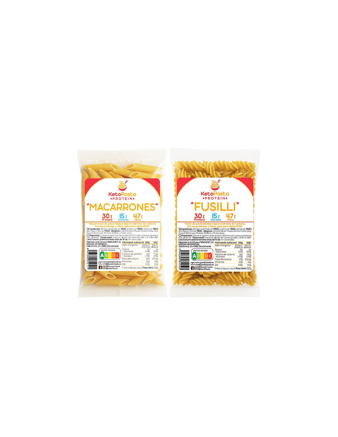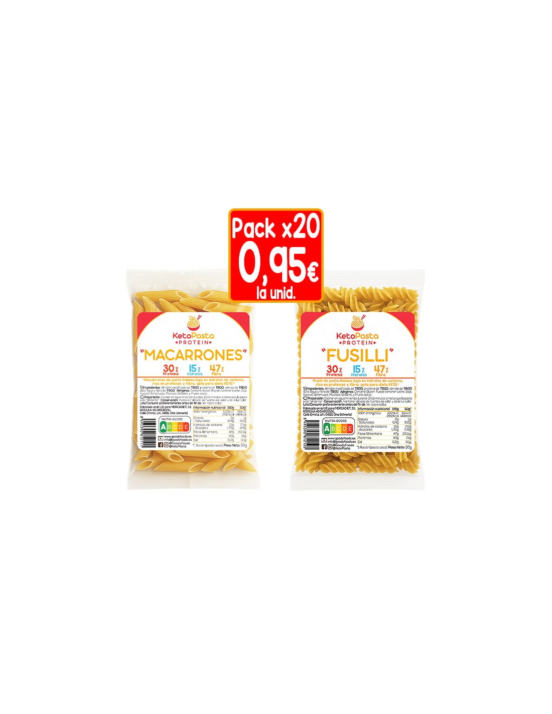 Con el Pack x20 Pasta Proteica KetoPasta tendrás al mejor precio 1000g, 20 raciones, de pasta italiana con un 30% de proteína, 47% de fibra y tan sólo un 15% de carbohidratos, siendo ideal para dieta KETO, proteica y Low Carb. Con este pack tendrás 10 unidades de Fusilli proteicos y 10 unidades de macarrones proteicos, a un precio de 0.95€ la unidad, en lugar de su precio recomendado de 1.10€, lo te te supondrá un ahorro de 3.05€.