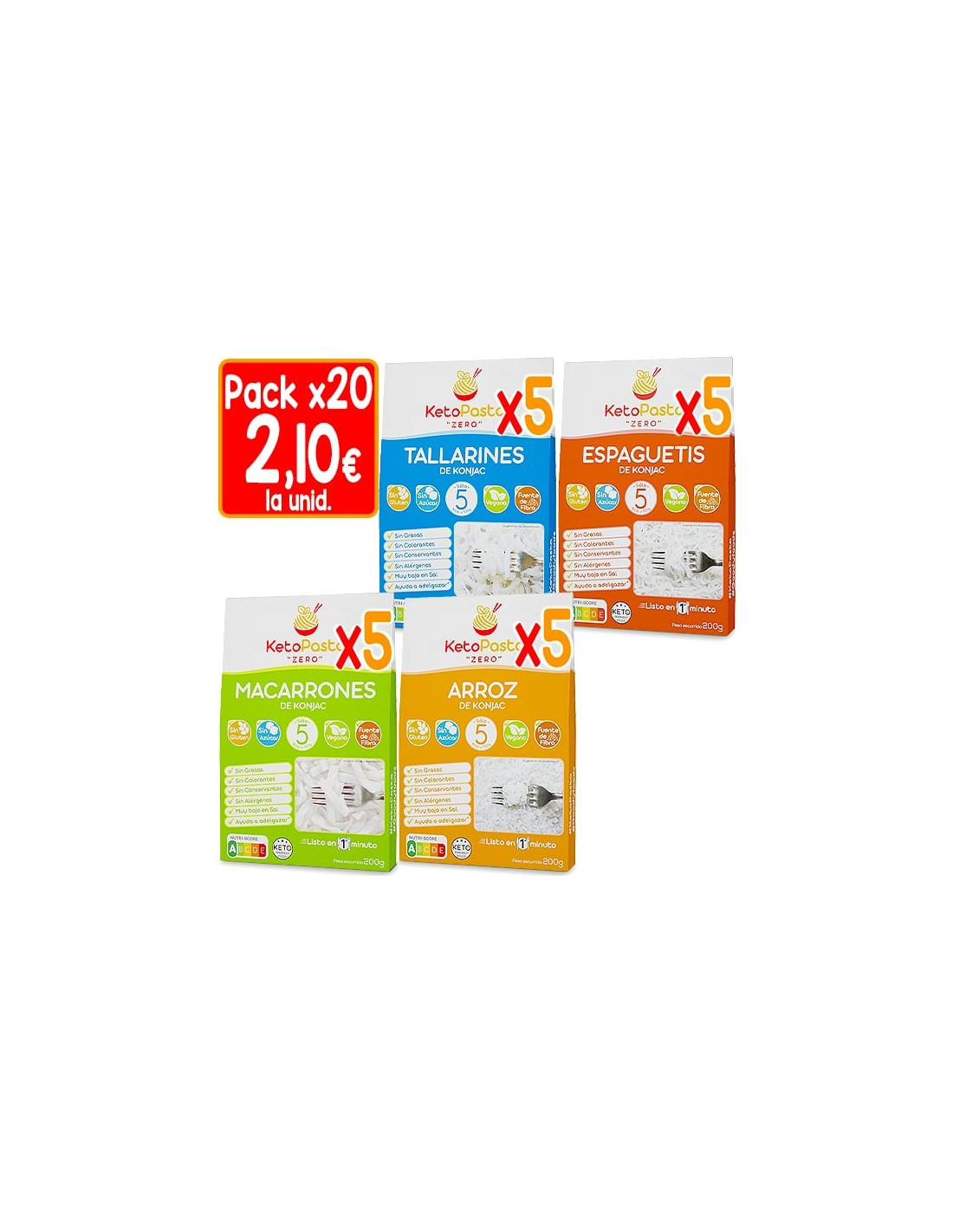 Con el Pack x20 Pastas Konjac KetoPasta ZERO tendrás 20 unidades de pasta konjac, con 5 unidades de cada variedad a un precio de 2.10€ la unidad, lo que te supondrá un ahorro de 7€ respecto al precio recomendado. Nuestra línea "KetoPasta ZERO" solo tiene 5 Kcal por cada 100g, sin azúcar, sin grasas, sin conservantes, sin colorantes ni alérgenos, sólo un 1% de carbohidratos, es fuente de fibra, Vegano y listo para comer en 1 minuto, siendo un alimento ideal para adelgazar y mantener la línea, e igualmente una opción ideal para personas con diabetes.
